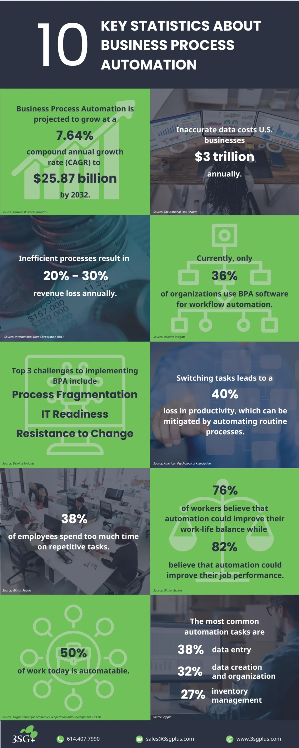 Business Process Automation is a strategic imperative for businesses looking to thrive in today’s competitive environment. With 3SG Plus, you can overcome the challenges of automation and unlock significant benefits for your organization. Click the button below to learn more about how we can help you transform your business with BPA.