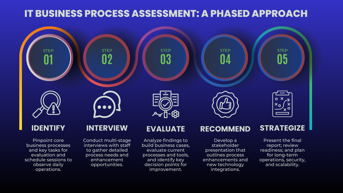 Technology is only as effective as the processes it supports. At 3SG Plus, our IT Business Process Assessments provide a structured, phased approach to evaluating your current workflows, identifying inefficiencies, and recommending strategies that align IT operations with business objectives.